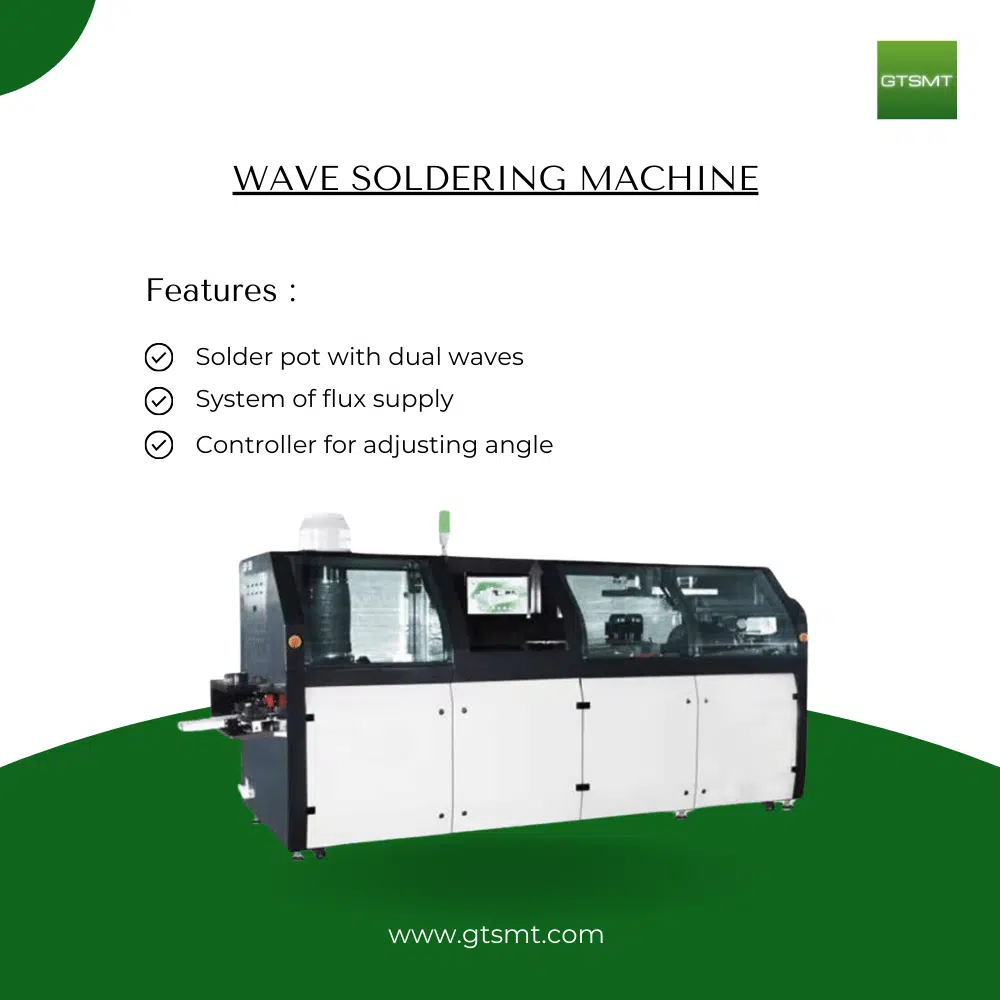 In a wave soldering machine, the PCB is first preheated and then conveyed over a pump-driven wave of molten solder. The wave contacts the exposed metal pads and component leads underneath the board, forming reliable solder joints. The entire process is automated and consists of several stages: